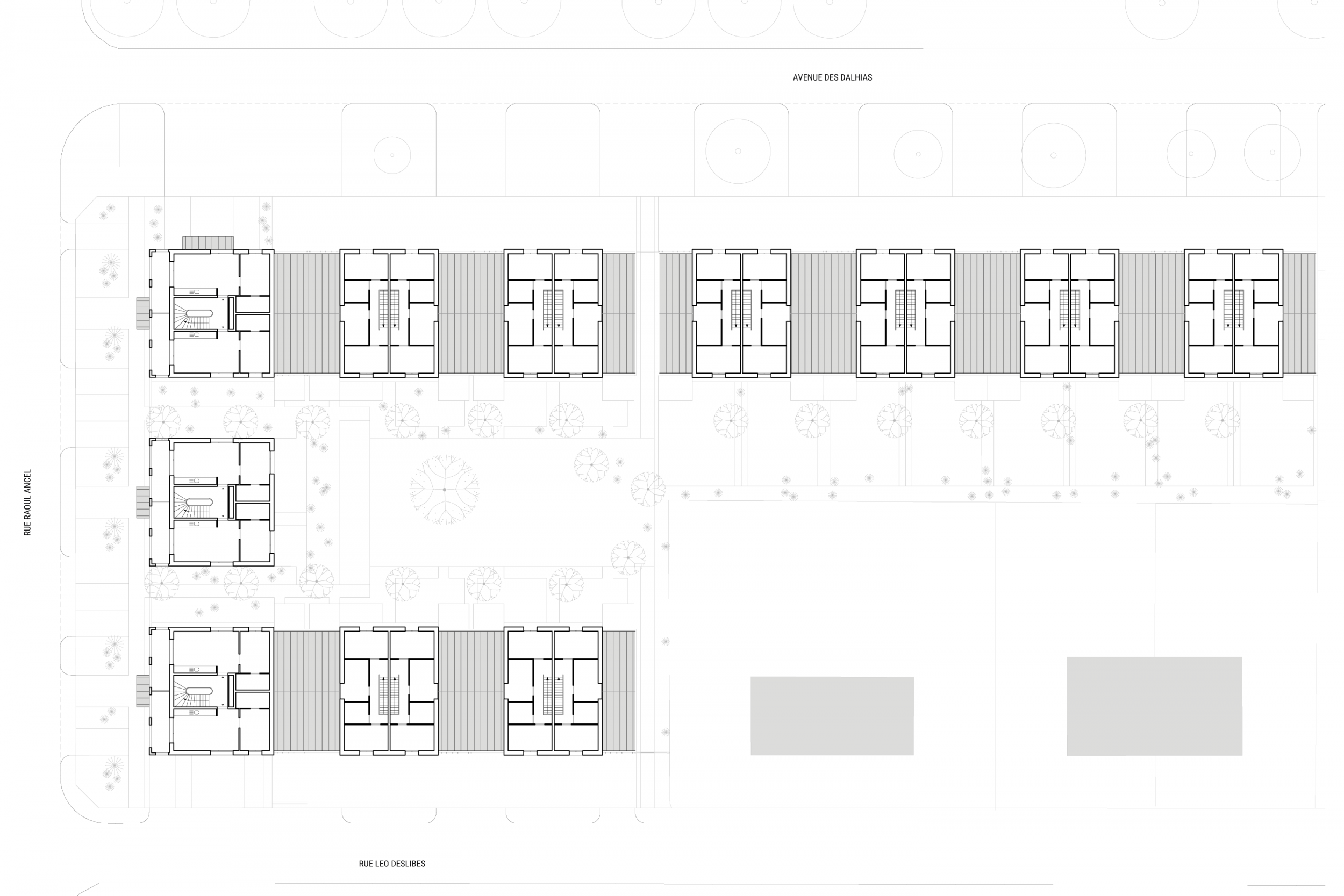 Les bâtiments semi-collectifs sont implantés en proue des îlots, et s’apparentent à de grandes maisons. Cette disposition crée un front urbain perméable et offre des percées visuelles vers le cœur d’îlot planté. Dans la continuité végétale du quartier, des jardins de statut et de gestion collective précèdent les bâtiments et participent à la qualité des rues tout en dissimulant les stationnements.