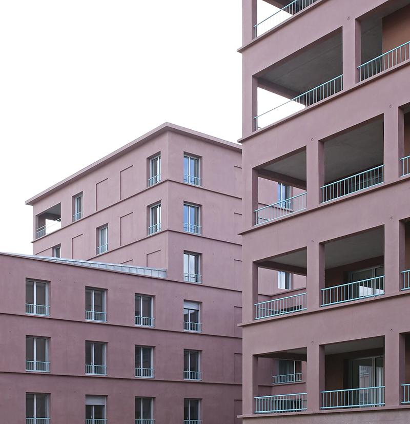 Our projects seek to enhance the simplicity and quality of its construction materials. The facades are made of exposed concrete, simply coated with a coloured and diluted mineral sealant. The minerality of the facades, whose tones echo those of the existing buildings (ochre, earth, brick, etc.), is enhanced by the blue colour of the handrail, and by the anodised aluminium fittings. This chromatic range thereby revives the history of a Nantes-style classicism in which stone and rendered facades are often combined with metal parts in more vivid tones.