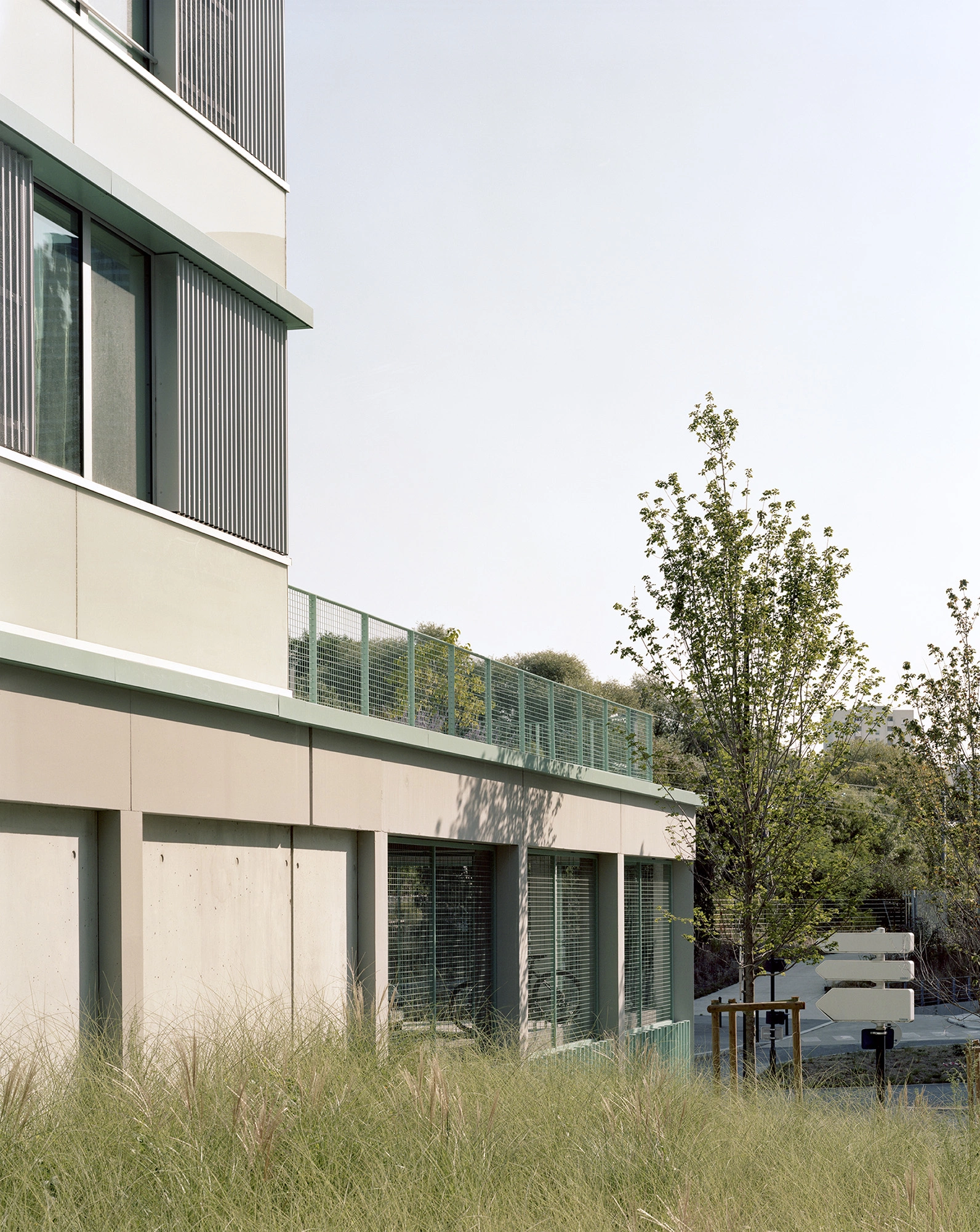 The base, anchored in the topography of the site, houses the communal developments, and its planted roof provides a garden level at the height of the neighbouring railway. The architecture of this lower stratum, structured by a network of beams and posts in raw concrete, borrows from the vocabulary of neighbouring structures, and makes optimal use of transparencies between the residence’s collective areas and the public spaces.